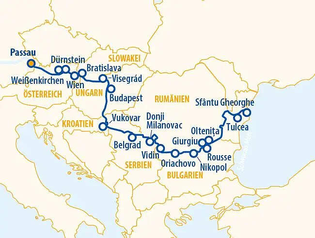 *Das Ausflugsprogramm ab Tulcea kann je nach politischer Entwicklung und Entscheidung durch den Kapitän ab Brăila (Rumänien) durchgeführt werden. Der Hafen Sfântu Gheorghe würde in diesem Fall durch z. B. Cernavodă (Rumänien) mit Ausflugsprogramm zum Schwarzen Meer ersetzt. Die Liegezeit in Rousse an Tag 10 verlängert sich dadurch.