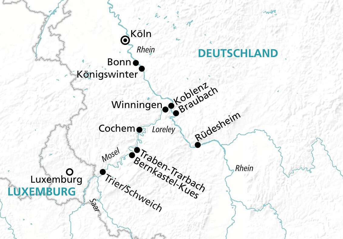 Freuen Sie sich auf traumhaft schöne Landschaften und unternehmen Sie mit MS Alena 2027 eine Zeitreise in die Geschichte der Mosel. Die Mosel ist von einer der schönsten deutschen Landschaften umgeben und untrennbar mit der deutschen Weingeschichte verbunden. Von Braubach aus können Sie die Marksburg besuchen - eine der schönsten Burgen Deutschlands. Auf der Straße der Römer reisen Sie auf der Mosel vom Limes bei Koblenz bis zur Kaiserstadt Trier. In Cochem sollten Sie eine Weinprobe machen und die weltbekannten Moselweine kosten. Und in Trier können Sie prachtvolle römische Bauwerke bestaunen - wie die Porta Nigra, das Wahrzeichen der Stadt. Und natürlich fahren Sie auch am weltberühmten Loreley-Felsen vorbei. Eine wundervolle Flusskreuzfahrt auf Rhein und Mosel liegt vor Ihnen!