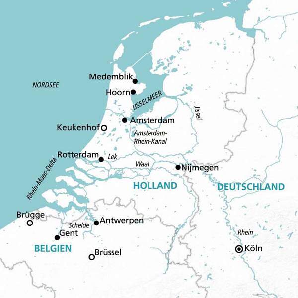 Wunderschöne und unzählige Grachten, Kanäle, Flüsse und Meeresarme durchziehen unsere beiden Nachbarländer Holland und Belgien. Hinzu gesellen sich malerischen alte Städtchen, sowie Städte, die Geschichte geschrieben haben. Hoorn am IJsselmeer, Amsterdam, Rotterdam, Gent und Antwerpen stehen auf Ihrem Programm mit MS Alina. Erleben Sie während dieser Rheinkreuzfahrt die Atmosphäre des sogenannten "goldenen Jahrhunderts" in Hoorn, durchstreifen Sie die Amstel-Metropole Amsterdam und besuchen Sie auf einem Landausflug die geschichtsträchtige EU-Stadt Brüssel. Ganz romantisch wird es dann auf einem Ausflug nach Brügge. Über Schelde und die Waal nimmt MS Alina dann wieder Kurs auf den Rhein und Ihre Flussreise auf dem Rhein endet nach einer Woche wieder in Köln.