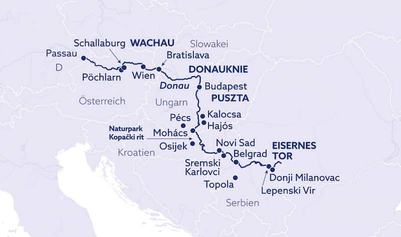 Zwischen den Karpaten und dem Balkangebirge liegt der Donaudurchbruch „Eisernes Tor“, der zu den eindrucksvollsten Flusstälern in ganz Europa zählt. Diese Abschnitt ist einfach spektakulär und ein Highlight einer jeden Donaukreuzfahrt. Hier hat sich die Donau auf rund 110 km einen Weg durchs Gebirge errungen. Darüber hinaus führt Sie diese Flussreise auf der Donau mit MS Maxima natürlich auch an malerischen Weinbergen vorbei und zu imposanten Donaumetropolen wie Wien, Bratislava, Budapest und Belgrad. Kunst und Kultur vereinen sich auf dieser Donaukreuzfahrt mit eindrucksvollen Landschaften.