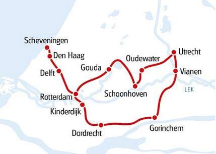 Von Schoonhoven radeln Sie in die berühmte Käsestadt Gouda. Bei schönem Wetter lohnt ein Abstecher zur Seenlandschaft Reeuwijkse Plassen für ein erfrischendes Bad. Weiter geht es nach Rotterdam. Der Rotterdamer Hafen ist nicht nur der größte Europas, sondern gehört auch zu den größten der Welt. Die Stadt hat sich in den letzten Jahren zu einer der architektonischen und kulturellen Metropole entwickelt.