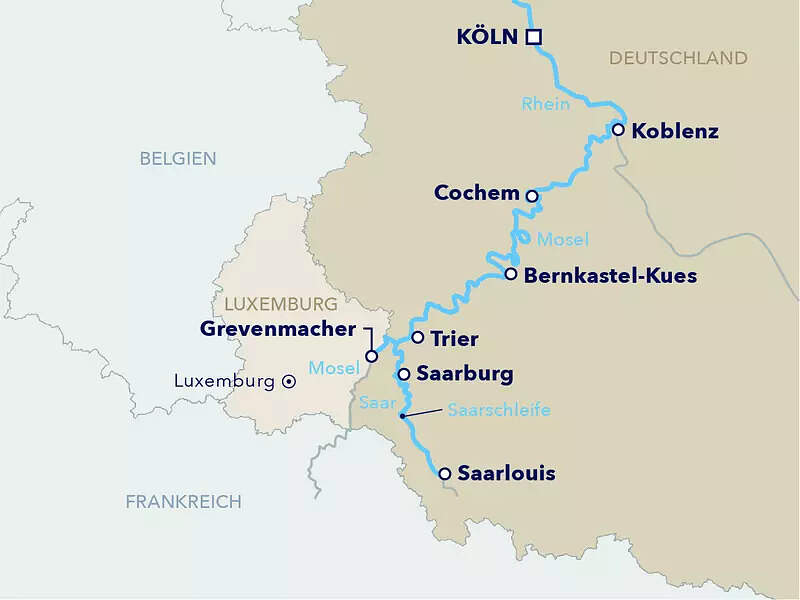 Kennen Sie die Schönheiten an Saar und Mosel? Sie können diese mit Amadeus Brilliant 2026 und auch 2027 kennen lernen. Freuen Sie sich auf den größten Nebenfluss des Rheins, der Mosel, und auf den kurvenreichen Lauf der Saar. Los geht es in der Domstadt Köln. Ihre Flusskreuzfahrt zeigt Ihnen malerische Landschaften, die von steilen Weinbergen geprägt sind. In Cochem können Sie durch die schmalen Gassen der Altstadt bummeln, mittelalterliche Städte und Städtchen besuchen und vom Sonnendeck aus die berühmte große Saarschleife bewundern. Auch machen Sie einen Schlenker nach Luxemburg und können dort das Weinanbaugebiet Grevenmacher kennen lernen. Willkommen an Bord von Amadeus Brilliant auf dieser faszinierenden Flussreise an Mosel und Saar.