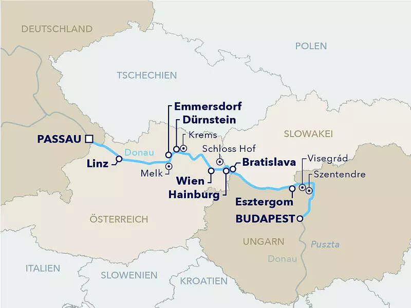 Stift Melk / Stadtrundgang Dürnstein mit Weinverkostung / Wien - Kaiserliche Residenzstadt / Besichtigung von Schloss Schönbrunn / Budapest - Königin der Donau / Ausflug in die Puszta / Esztergom und Szentendre / Bratislava / Weingut Raca und die Weinregion der Kleinkarpaten / Stadtrundgang Linz mit Linzer Torte