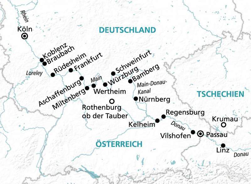 All Inclusive Flusskreuzfahrt mit MS Amina über den Main-Donau-Kanal - reisen Sie auf Donau, Main und Rhein von Passau bis nach Köln. Auf Ihrem Weg liegen malerische Landschaften - wie das UNESCO geschützte Mittelrheintal. Historische Städte wie Nürnberg, Würzburg und Bamberg werden Sie genauso besuchen wie das kleiner Wertheim oder Aschaffenburg. Und ein Reisehöhepunkt ist sicherlich die Fahrt über den Main-Donau-Kanal. Lassen Sie sich von pittoresken Häuserfassaden ebenso verzaubern wie vom Donaudurchbruch. Willkommen an Bord von MS Amina auf dieser Flussreise auf dem Main.