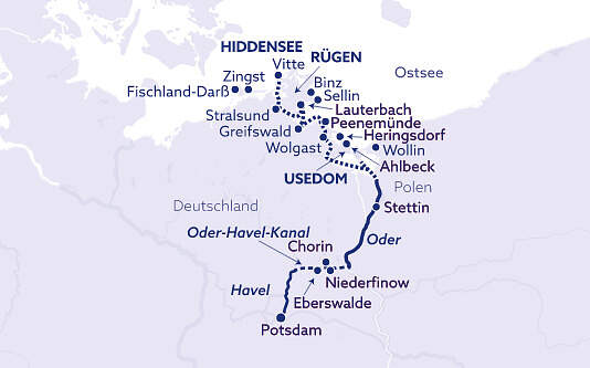 Erleben Sie zwischen der alten Hansestadt Stralsund und Potsdam an Bord von MS Katharina von Bora die wunderschöne Ostseeküste und die Schönheiten an Oder und Havel. Lernen Sie die deutschen Ostseeinseln Usedom, Rügen und Hiddensee kennen, staunen Sie über das Schiffshebewerk in Niederfinow und genießen Sie im Nationalpark Unteres Odertal die herrliche Natur. Auch wird Ihre Flussreise zur "Seefahrt". Machen Sie einen Schnappschuss von der berühmten Bäderarchitektur und von den charakteristischen Seebrücken. Willkommen an Bord von MS Katharina von Bora auf dieser beliebten Flussreise im Norden Deutschlands.