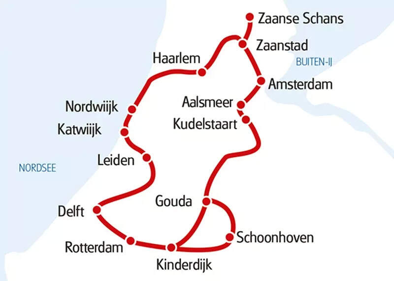 Nach einer kurzen Schifffahrt erreichen Sie "Zaanse Schans". Dieses komplette bewohnte Freilichtmuseum ist einem holländischen Dorf aus dem 18. und 19. Jh. nachempfunden. Bestaunen Sie die alten Windmühlen, besuchen Sie eine traditionsreiche Käserei oder einen Holzschuhmacherei. Mit dem Rad geht es dann nach Haarlem. Bummeln Sie am Abend noch ein wenig durch die hübsche Altstadt. Haarlem ist die Hauptstadt der Region Nordholland und Zentrum der Tulpenzwiebelregion. Die Radetappe kann nach Belieben über die große Nordsee-Schleuse in IJmuiden und durch die Dünenlandschaft verlängert werden.