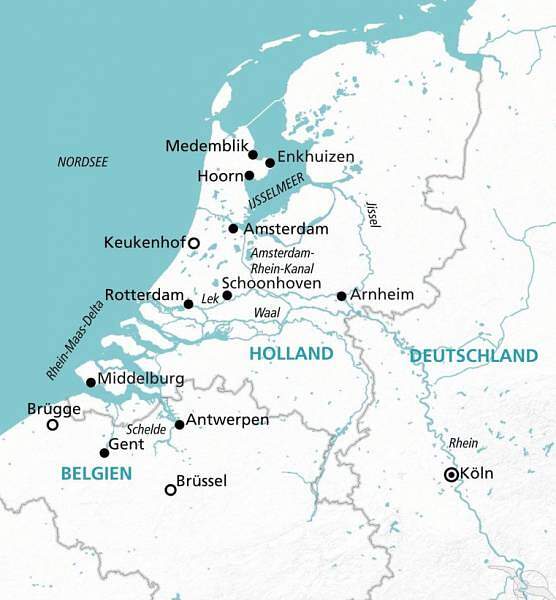 Ganze 11 Tage lang erleben Sie an Bord unserer MS Alena den Rhein in nördliche Richtung. Los geht es in der Domstadt Köln. Von dort reisen Sie entlang des Niederrheins nach Holland und Belgien. Erste Station ist die Hafenmetropole Rotterdam, bevor es über die vielen Grachten und Kanäle nach Antwerpen und Gent in Belgien geht. Hier unternehmen Sie auch eine Fahrt über die Schelde. Ein Stopp in Middelburg ist ebenso geplant wie in Schoonhoven. Und dann erwartet Sie bereits die herrliche Grachtenstadt Amsterdam, wo Sie über Nacht bleiben. Genießen Sie die Vielfalt und Holland und Belgien, bevor Ihre Flussreise nach zehn Tagen in Köln wieder zu Ende geht.