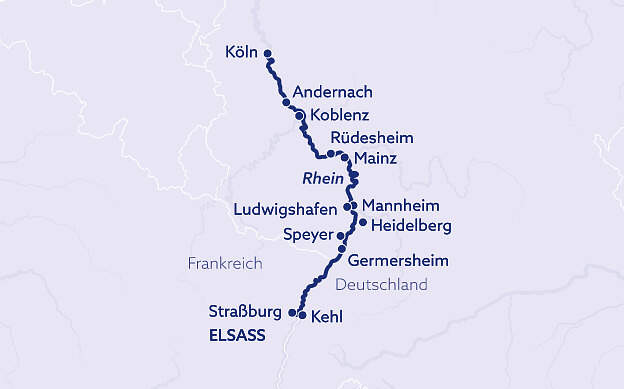 Köln - Straßburg - Rüdesheim - Köln. So lautet in Kurzform die Reiseroute Ihrer einwöchigen Rheinkreuzfahrt. Mit unserer beliebten MS Rhein Symphonie lernen Sie zwischen Mai und September 2026 die Höhepunkte auf dem Rhein kennen, genauer gesagt auf dem südlichen Rhein. Es erwartet Sie das wunderbare Straßburg mit den unzähligen Sehenswürdigkeiten, die Fahrt durch das UNESCO Welterbe Mittelrheintal oder Speyer, in dem sich einer der berühmten deutschen Kaiserdome befindet. Auf spannenden Landausflügen können Sie das malerische Elsass erkunden, oder dem romantischen Heidelberg am Neckar einen Besuch abstatten. Erleben Sie unvergessliche Momente auf dieser klassischen Rheinkreuzfahrt!