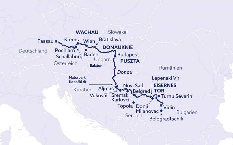 Erleben Sie an Bord unserer MS Celina die Schönheiten entlang der Donau und im Osten Europas. Es geht bis nach Bulgarien und wieder zurück. Dabei besuchen Sie gleich 7 Donauländer. Malerische Landschaften prägen das Bild Ihrer Flussreise: die wunderschöne Wachau, der beeindruckende Taldurchbruch der Donaukatarakte, die Karpaten und das Eiserne Tor... Auf dieser Flusskreuzfahrt auf der Donau erleben Sie natürlich zudem die "Donauhauptstädte" - wie Wien, Budapest oder Belgrad. Aber Sie wandeln auch abseits der Touristenströme. So können Sie zum Beispiel Belogradtschik oder auch Vukovar in Kroatien erkunden. Eine Haustürabholung und ein Getränkepaket sind zubuchbar.