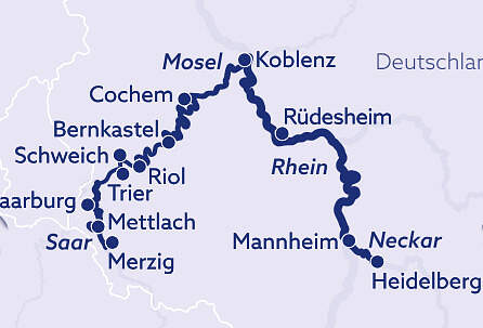 Erleben Sie eine unvergessliche Flusskreuzfahrt auf Saar, Mosel, Rhein und Neckar an Bord unserer eleganten MS Katharina von Bora - von Merzig bis Mannheim. Diese außergewöhnliche Flussreise verbindet eindrucksvoll römisches Erbe, mittelalterliche Romantik und weltberühmte Flusslandschaften. Malerische Weinberge, imposante Burgen und charmante Altstädte begleiten Sie auf einer Route, die zu den schönsten Flusstälern Deutschlands zählt und Kultur, Genuss und Entspannung perfekt vereint. Bereits an der Saar erwarten Sie mit Merzig, Mettlach und Saarburg idyllische Orte mit historischer Tiefe, darunter die berühmte Saarschleife und die romantische Altstadt von Saarburg mit ihrem Wasserfall. In Trier, der ältesten Stadt Deutschlands, tauchen Sie in die Welt der Römer ein und bewundern UNESCO-Welterbestätten wie die Porta Nigra. Entlang der Mosel verzaubern Bernkastel-Kues und Cochem mit Fachwerk, steilen Weinlagen und der majestätischen Reichsburg. Am Zusammenfluss von Rhein und Mosel empfängt Sie Koblenz mit dem Deutschen Eck, bevor Sie im Mittelrheintal bei Rüdesheim weltberühmte Weinorte und Burgenpanoramen erleben. Den krönenden Abschluss bilden Heidelberg mit seinem romantischen Schloss und die lebendige Universitätsstadt Mannheim, wo Neckar und Rhein zusammenfließen.