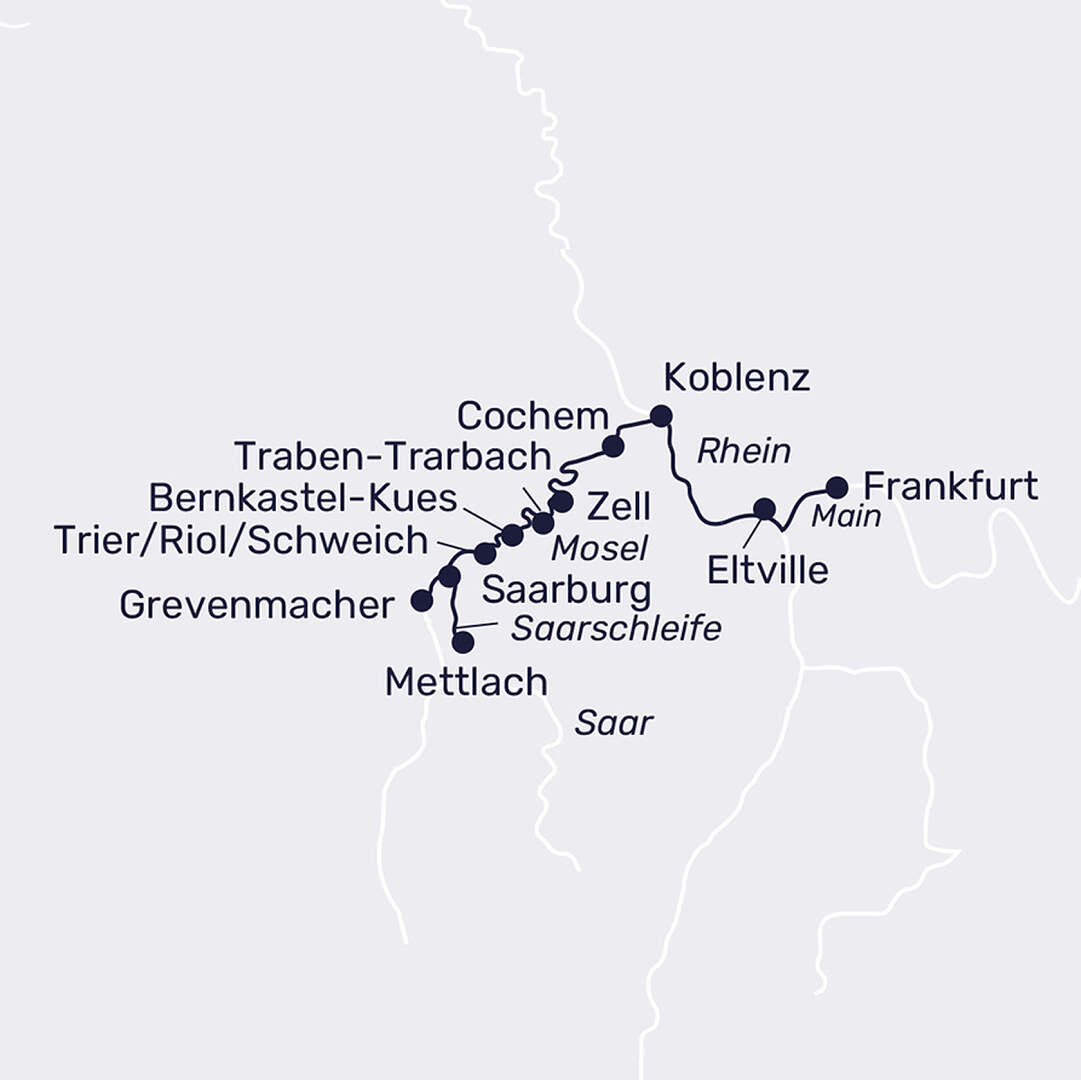 Erleben Sie eine unvergessliche Flusskreuzfahrt auf Mosel und Saar mit MS Lady Cristina und entdecken Sie eine der romantischsten Kulturlandschaften Deutschlands. Sanft schlängeln sich Mosel und Saar durch steile Weinberge, idyllische Winzerorte und geschichtsträchtige Städte - perfekte Voraussetzungen für eine genussvolle Flussreise voller Panorama-Momente. Vom berühmten Deutschen Eck in Koblenz, wo Mosel und Rhein zusammenfließen, bis zu den malerischen Moselschleifen bietet diese Flussreise eindrucksvolle Natur, Kultur und Genuss in harmonischer Verbindung. Historische Burgen, römisches Erbe und charmante Altstädte begleiten Sie Tag für Tag und machen diese Reise zu einem besonderen Erlebnis für alle Sinne. Die Route führt Sie ab Frankfurt über Koblenz, Cochem, Trier, Mettlach und Saarburg zu den schönsten Orten entlang von Mosel und Saar. In Cochem thront die imposante Reichsburg über der Altstadt, während Trier mit der Porta Nigra und römischen Baudenkmälern UNESCO-Welterbe-Flair versprüht. In Mettlach eröffnet sich Ihnen von der Cloef ein spektakulärer Blick auf die weltberühmte Saarschleife, eines der bekanntesten Naturmotive Deutschlands. Romantische Weinstädte wie Bernkastel-Kues und Zell an der Mosel laden zum Bummeln und Genießen regionaler Spezialitäten ein, bevor Sie im eleganten Eltville im Rheingau auf Schlösser, Rosen und Weintradition treffen. Entspannt kehren Sie schließlich nach Frankfurt zurück - im Gepäck unvergessliche Eindrücke einer der schönsten Flusslandschaften Europas.