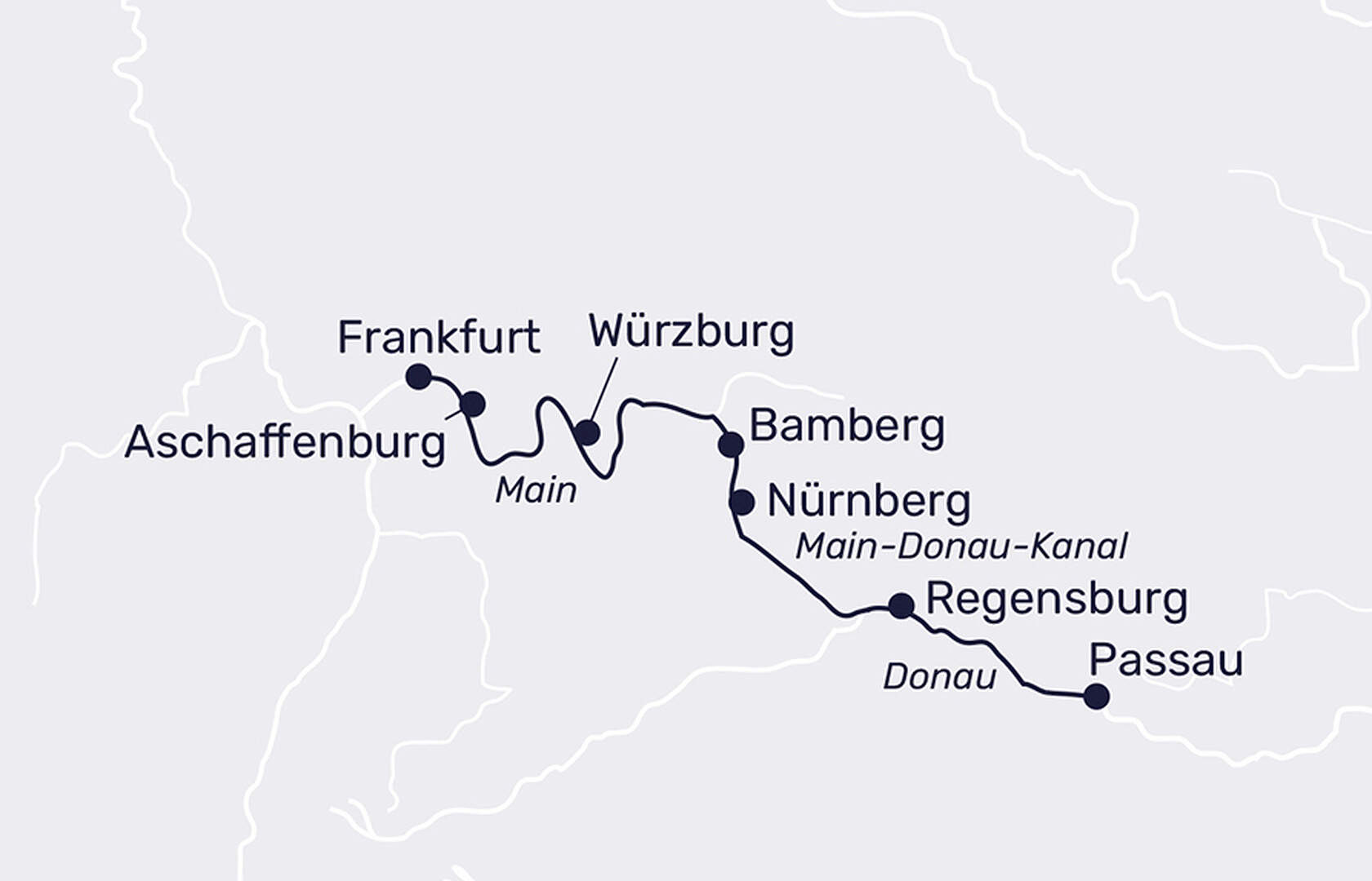 Gönnen Sie sich eine 8-tägige Weihnachtskreuzfahrt auf dem Main-Donau-Kanal und erleben Sie die festliche Jahreszeit besonders entspannt vom Wasser aus. Bereits in Frankfurt am Main kommen Sie in Weihnachtsstimmung, während Ihr Schiff Kurs auf einige der schönsten Städte Süddeutschlands nimmt. Stimmungsvolle Weihnachtsmärkte, winterliche Flusslandschaften und kulturelle Höhepunkte machen diese Flussreise über Weihnachten zur perfekten Kombination aus Genuss, Geschichte und Besinnlichkeit. Die Route entlang von Main, Main-Donau-Kanal und Donau zählt zu den beliebtesten Flusskreuzfahrten im Winter und begeistert mit abwechslungsreichen Panoramen und kurzen Wegen zu den Sehenswürdigkeiten. In Aschaffenburg begrüßt Sie das prachtvolle Renaissanceschloss Johannisburg, bevor Würzburg mit der eindrucksvollen Festung Marienberg und barocker Altstadt verzaubert. Das UNESCO-Welterbe Bamberg beeindruckt mit seiner historischen Altstadt und festlicher Atmosphäre, während Sie nach dem Besuch von Nürnberg den Heiligabend an Bord festlich verbringen. Weiter geht es nach Regensburg, wo mittelalterliche Gassen und der nahegelegene Donaudurchbruch ein unvergessliches Naturerlebnis bieten. Den stimmungsvollen Abschluss bildet Passau, die Drei-Flüsse-Stadt, in der Main-Donau-Kanal und Donau Ihre Weihnachtskreuzfahrt harmonisch ausklingen lassen.