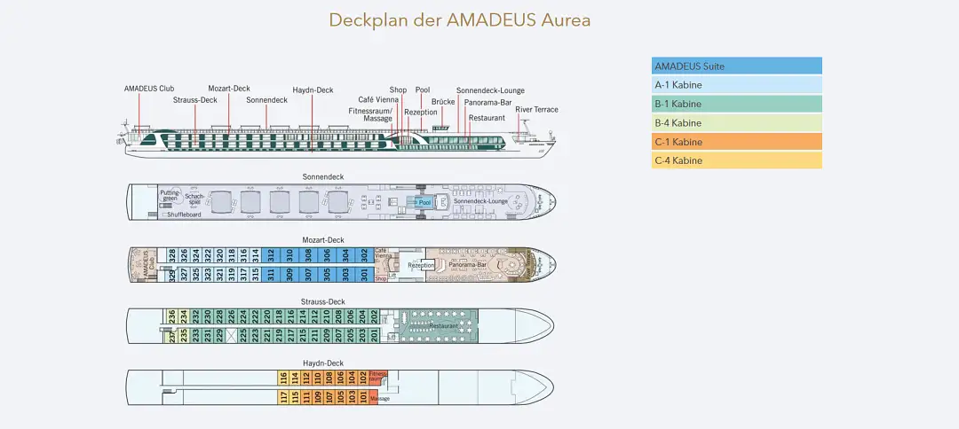 Die Amadeus Aurea, die 2026 ihren Dienst antritt und ein Schwesterschiff der Amadeus Mira ist, vereint modernes Design, höchsten Komfort und innovative Technik zu einem außergewöhnlichen Flussschiff. An Bord erwarten Sie 12 großzügige Suiten mit Balkon sowie 67 helle Außenkabinen mit Panoramafenstern, die beste Ausblicke garantieren. Kulinarisch verwöhnt das stilvolle Panorama-Restaurant, während das Sonnendeck mit Pool und Lido-Bar Raum für Entspannung bietet. Ein moderner Fitnessraum steht für aktive Gäste zur Verfügung, die „River Terrace“ lädt zum Verweilen und Genießen ein. Dank fortschrittlicher Umwelttechnologien wie Hybridantrieb und effizienter Wärmerückgewinnung reisen Sie komfortabel und nachhaltig zugleich. MS Aurea ist auf Rhein, Donau und dem Main-Donau-Kanal unterwegs.