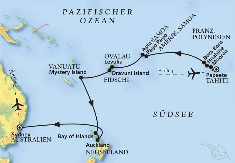 Zunächst einmal erleben Sie wunderbare Südseeträumereien in Polynesien, bevor es mit MS Amera im Februar 2026 von der Südsee in Richtung "Down Under" geht. Freuen Sie sich auf Moorea und Bora-Bora, auf Tahiti und Huahine. Allesamt malerische Inselparadiese in Franz. Polynesien. Hier trifft tropisch auf üppiges Grün, azurblaues Wasser, auf schneeweiße Strände. Nach erholsamen Tagen auf See und einem Besuch von Amerikanisch Samoa überqueren Sie die Datumsgrenze und erreichen Samoa, die Fidschi Inseln und Vanuatu. Auch hier erwarten Sie herrlich weiße Strände an Land und bunte Korallenriffe im Meer. Kurz darauf können Sie die Nordinsel Neuseelands erkunden, bevor Sie in die Bucht von Sydney einfahren. Bei dieser Kreuzfahrt sind die Flüge ab/an Frankfurt für Sie bereits inklusive.