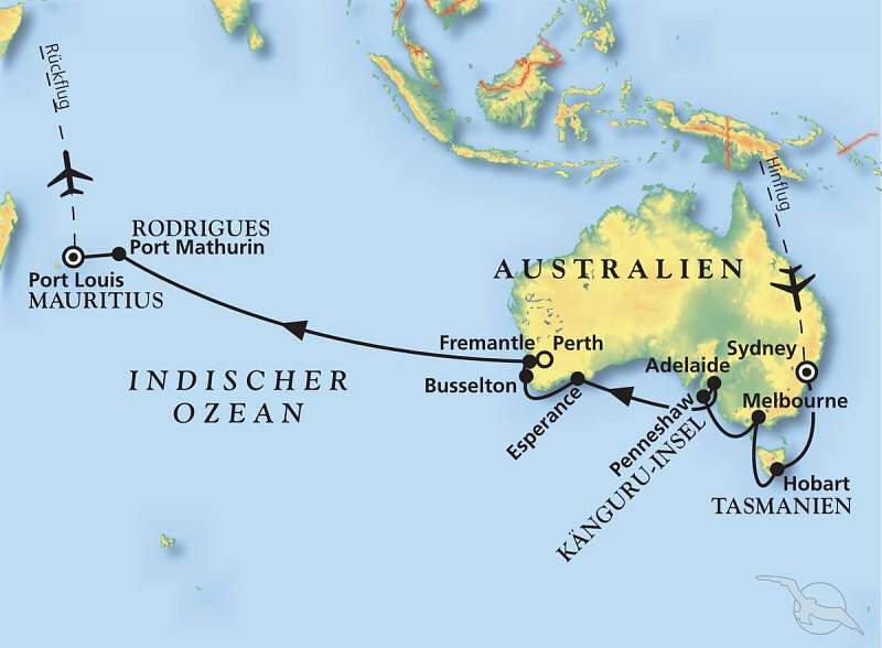Per Flug reisen Sie von Frankfurt aus ganz bequem nach Sydney, wo MS Amera zur Einschiffung auf Sie wartet. Erkunden Sie die wunderschöne Hafenstadt mit dem berühmten Sydney Opera House, bevor es nach Tasmanien geht. Hier erwarte Sie üppige Regenwälder und eindrucksvolle Berglandschaften. Weiter geht es nach Melbourne, zur Känguru Insel und nach Western Australia. Erleben Sie die schönsten Zielen in Down Under! Nach erholsamen Tagen auf See geht es schließlich nach Mauritius, gelegen im Indischen Ozean. Hier erwarten Sie traumhafte Strände, aber auch eine üppige Natur. Ein kleines Paradies.