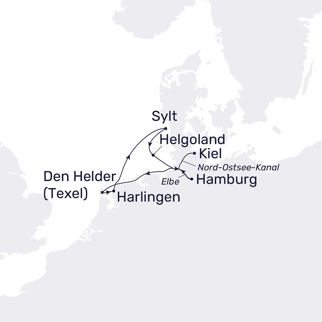 Von Hamburg aus nimmt die MS Hamburg ihren Kurs auf der Elbe - bis sich schließlich das endlose Blau der Nordsee vor Ihnen auftut. Was wird diese Reise wohl bereithalten? Auf Sylt, der größten nordfriesischen Insel, erwarten Sie reetgedeckte Friesenhäuser und kilometerlange Strände, die Sonne und Meeresbrise in Einklang bringen. Im niederländischen Harlingen flanieren Sie entlang malerischer Grachten, vorbei am barocken Rathaus und der eindrucksvollen neugotischen St.-Michael-Kirche am Zuiderhaven. Texel, die größte der westfriesischen Inseln, empfängt Sie mit maritimem Charme und überraschend grüner Dünenlandschaft - vielleicht lockt sogar ein Besuch im Strandräuber-Museum. Zum krönenden Abschluss Ihrer Reise steuern Sie Helgoland an, bevor die Fahrt durch den Nord-Ostsee-Kanal Ihnen noch einmal beeindruckende Ausblicke schenkt.