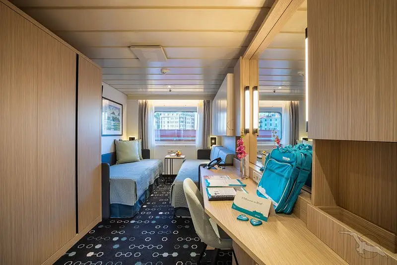 Die 2-Bett-Außenkabinen ohne Sichtbehinderung sind mit großem Fenster (nicht zu öffnen) ausgestattet. Sie verfügen über 2 untere Betten (auf Wunsch zusammenstellbar).