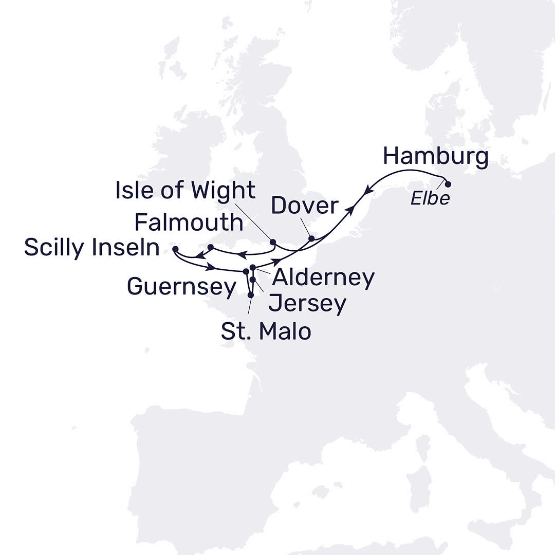 Von Hamburg aus nimmt MS Hamburg ihren Kurs Richtung Großbritannien und Frankreich. Auf dieser Reise treten England und Frankreich in einem charmanten Wettstreit um Ihre Aufmerksamkeit an. Den Auftakt macht England: Entdecken Sie die wilde Küste der Isle of Wight und die sanften Hügel Cornwalls, schlendern Sie durch das beschauliche Hugh Town auf den Scilly-Inseln oder besuchen Sie auf Guernsey das eindrucksvolle Castle Cornet. Auf Jersey genießen Sie den Blick von Mont Orguiel über den malerischen Hafen, während Sie auf Alderney von den hohen Klippen aus den funkelnden Ärmelkanal überblicken. Frankreich wiederum lockt mit dem stimmungsvollen St. Malo, dem legendären Mont Saint Michel und der türkisfarbenen Smaragdküste. Ein kurzer Abstecher nach Dover oder London rundet die Reise ab, bevor Sie der Hamburger Hafen wieder willkommen heißt.