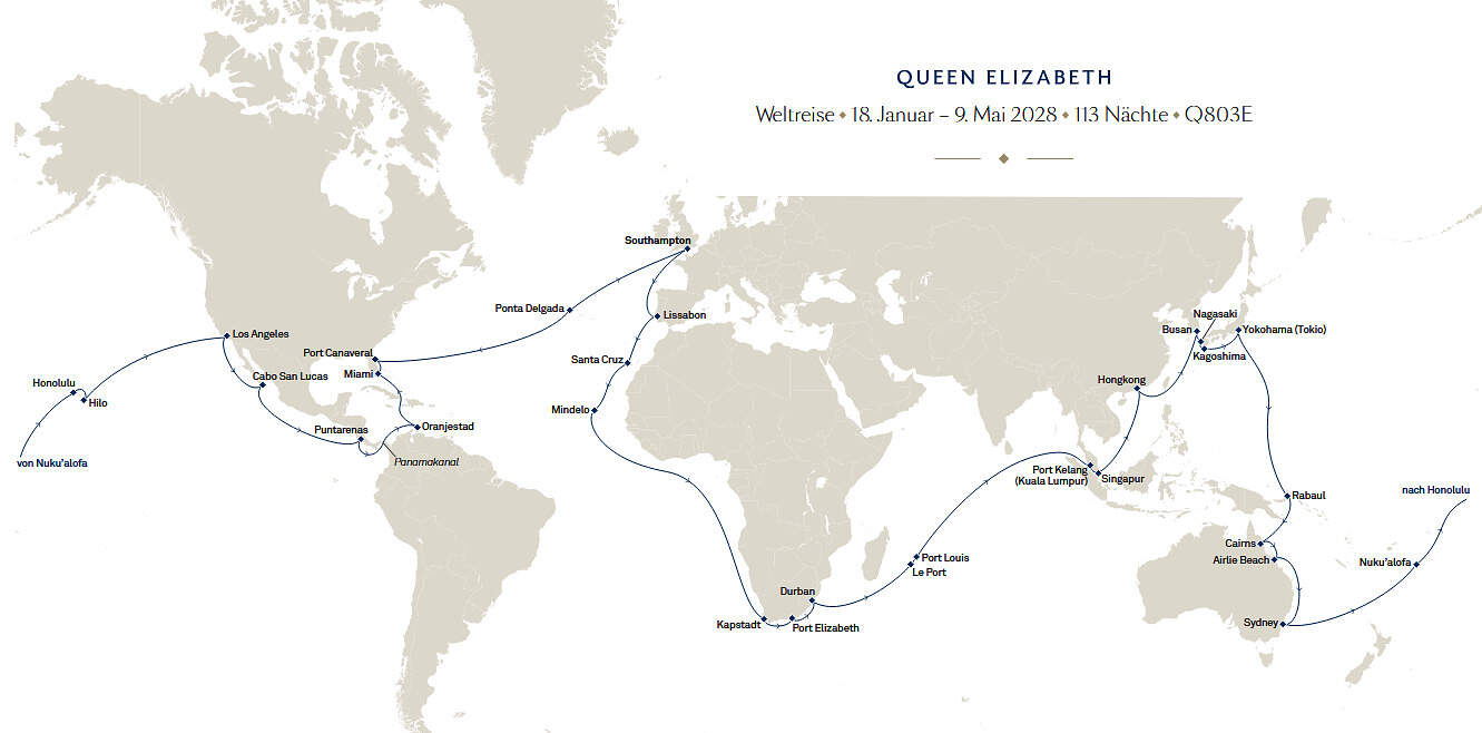 Die Welt in 113 Nächten erleben - Ihre große Entdeckungsreise mit der Queen Elizabeth. Begeben Sie sich 2028 auf eine unvergessliche Weltreise an Bord der legendären Queen Elizabeth und erleben Sie das Abenteuer Ihres Lebens. Ab und an Southampton führt Sie diese außergewöhnliche Route in 113 Nächten einmal rund um den Globus - Richtung Osten, durch faszinierende Kulturen, atemberaubende Landschaften und ikonische Weltmetropolen. Freuen Sie sich auf Übernachtaufenthalte in Kapstadt, Hongkong, Yokohama und Sydney sowie auf unzählige weitere Höhepunkte entlang der Reise: von der Atlantikküste Europas über Afrikas Westküste, das underbare Mauritius und das exotische Malaysia bis nach Japan, Papua-Neuguinea und Australien. Weiter geht es zu den Trauminseln im Pazifik - Tonga und Hawaii - bevor Sie über Cabo San Lucas in Mexiko, Aruba und Florida wieder zurück nach Europa gelangen. Erleben Sie spektakuläre Passagen, legendäre Häfen und den unvergleichlichen Cunard-Stil, der Tradition, Eleganz und modernen Komfort zu einem einmaligen Reiseerlebnis verbindet.