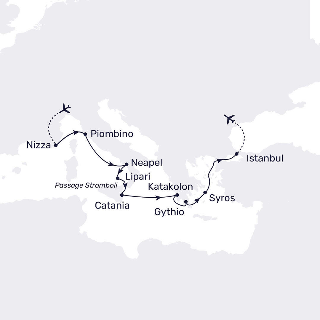 Ihre 11-tägige Mittelmeerkreuzfahrt mit MS Hamburg beginnt mit französischem Flair in Nizza, bevor Sie Italien mit seinen Schätzen verführt: der mächtigen Fortezza Medicea, den charmanten Gassen und der malerischen Küste rund um Livorno. In Neapel erwarten Sie unzählige Kirchen und Paläste, spannende Geschichten rund um den Vesuv und die faszinierende vulkanische Welt der Liparischen Inseln. Nach einem respektvollen Blick auf den feuerspeienden Stromboli eröffnet sich Ihnen das Panorama des majestätischen Ätna - welcher der beiden Giganten wird Ihr Herz erobern? In Griechenland tauchen Sie in die antike Atmosphäre von Olympia ein und erkunden die geheimnisvollen byzantinischen Ruinen von Mistras. Ein letzter, beeindruckender Blick in die Blaue Moschee und die Hagia Sophia, und Ihre Reise findet in Istanbul ihren märchenhaften Abschluss. Bei dieser Kreuzfahrt durch das östliche Mittelmeer sind übrigens für Sie die Flüge ab/an Deutschland bereits inklusive.