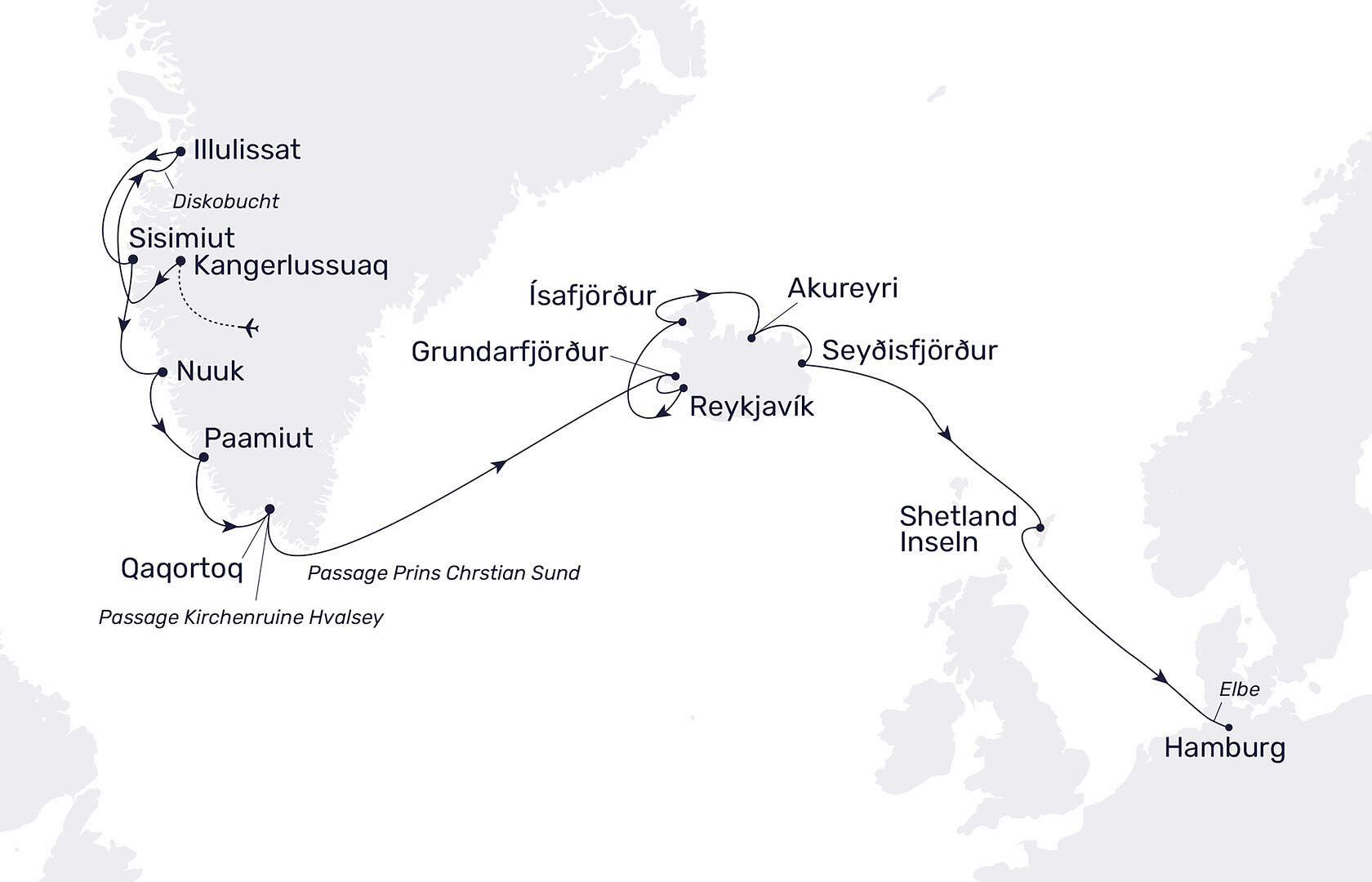Freuen Sie sich auf eine herrliche Grönland Kreuzfahrt mit unserer beliebten MS Hamburg. Strahlende Eisberge, markante Felsformationen und die weite, fast mystische Tundra verleihen Grönland seinen unverwechselbaren Zauber. Vom Boot aus, zu Fuß oder aus der Luft entdecken Sie den beeindruckenden Eisfjord auf die für Sie schönste Weise, bevor Sie in Sisimiut den freundlichen Schlittenhunden begegnen. In Nuuk enthüllen die faszinierenden Inuit-Mumien im Nationalmuseum die Geheimnisse vergangener Kulturen, während Sie anschließend die wilde Inselwelt Grönlands ganz unmittelbar erleben. Weiter nördlich lockt Island: Streifen Sie während Ihrer Arktiskreuzfahrt durch die nördlichste Hauptstadt der Welt, folgen Sie den Spuren der Wikinger oder begegnen Sie Papageientauchern und Walen in freier Natur. Spektakuläre Geysire, mächtige Gletscher und donnernde Wasserfälle sorgen für unvergessliche Eindrücke. Und als weiteres Highlight Ihrer Route erwarten Sie mit MS Hamburg die schottischen Shetland-Inseln - ein charmantes Kapitel voller nordischer Traditionen und rauer Schönheit. Während dieser Grönland Kreuzfahrt ist der Hinflug ab Frankfurt für Sie bereits inklusive.