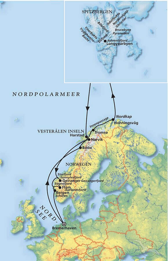 Diese 18-tägige Norwegenkreuzfahrt mit MS Amera ab/an Bremerhaven lädt Sie ein zu einer Reise voller Magie, Weite und nordischer Eleganz. Ab Bremerhaven gleitet Ihr deutschsprachiges First-Class-Schiff in Richtung Arktis und eröffnet Ihnen eine Welt spektakulärer Naturkulissen - vom tiefblauen Geirangerfjord über die legendäre Flåmbahn bis zum majestätischen Nordkap. In der traditionsreichen Hansestadt Bergen begegnen Sie skandinavischem Flair, bevor Sie sich auf den Weg in die faszinierende Wildnis Spitzbergens machen, wo die bizarren Gebirgsformationen und eindrucksvollen Gletscherlandschaften eine ganz eigene, fast mystische Atmosphäre schaffen. Während Sie an Land die Schönheit Norwegens aus nächster Nähe erleben, genießen Sie an Bord die liebevolle Fürsorge der familiären Phoenix-Crew, kulinarische Genüsse und den Komfort eines Schiffes, das auf entspannte Eleganz setzt. Die "Weißen Nächte“ nördlich des Polarkreises verleihen dieser Norwegenkreuzfahrt einen besonderen Zauber: lange, lichtdurchflutete Abende, die die spektakuläre Natur in warmes Schimmern tauchen - ein Schauspiel, das Sie so schnell nicht vergessen werden.