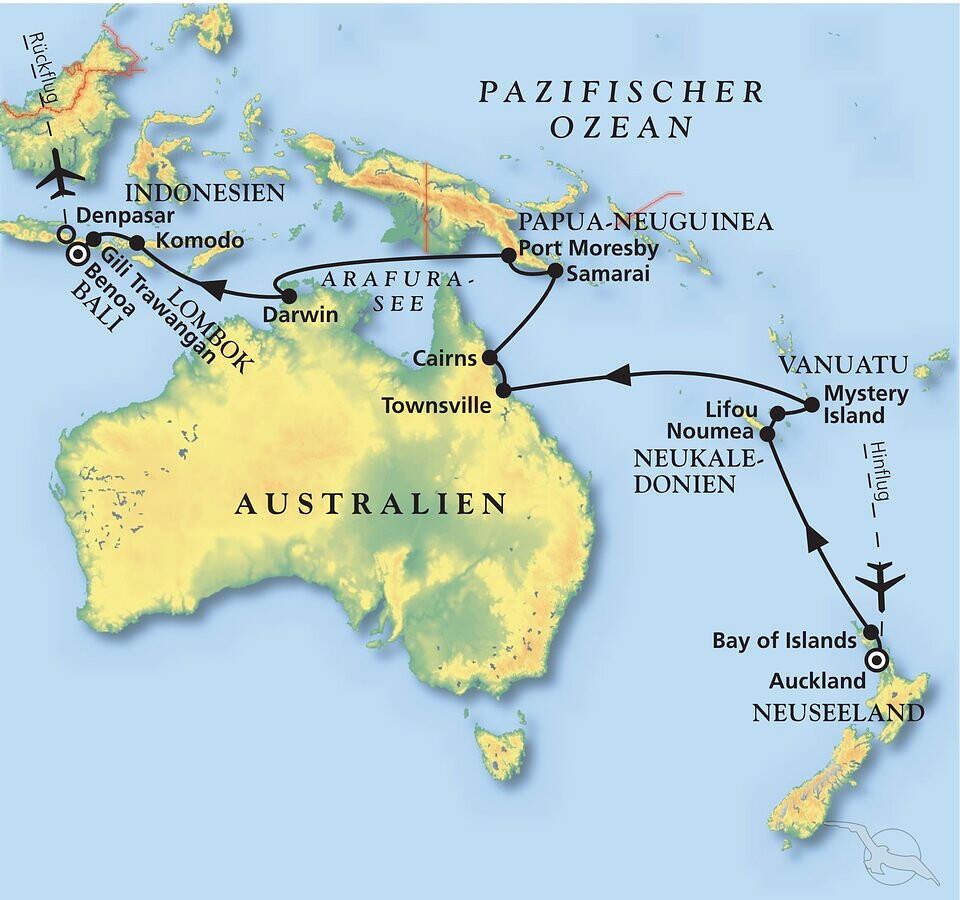 Ihre Kreuzfahrt mit MS Artania führt Sie von den traditionsreichen Kulturen der Maoris auf Neuseeland bis zur tropischen Trauminsel Bali in Indonesien. Eine Reise voller Kontraste, faszinierender Natur und unvergesslicher Begegnungen. Dabei lernen Sie die entlegenen Inselwelten Neukaledoniens und Vanuatus kennen, entdecken Papua-Neuguina und den tropischen Norden Australiens. Wie wäre es mit einem Ausflug ins Land der Maori oder zum einzigartigen Great Barrier Riff? Ein unvergessliches Erlebnis. Nach erholsamen Tagen auf See, während MS Artania durch das Korallenmeer kreuzt, erreichen Sie das australische sonnenverwöhnt Queensland. Weiter geht es durch die Arafurasee nach Indonesien und nach Indonesien. Besuchen Sie die imposanten Komodowarane und erleben Sie balinesische Dörfer. An Bord werden Sie mit kulinarischen Köstlichkeiten versorgt und ein abwechslungsreiches Angebot lässt keine Langeweile aufkommen. Bei dieser Reise sind die Flüge ab/an Frankfurt für Sie bereits inklusive. So beginnt Ihr Urlaub von Anfang bis Ende ganz entspannt.