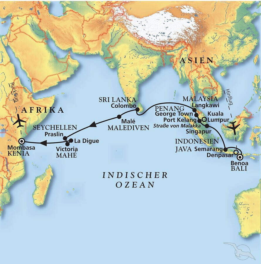 Begeben Sie sich im März 2027 an Bord unserer deutschsprachigen MS Artania auf eine außergewöhnliche Kreuzfahrt, die Sie von der Götterinsel Bali bis an die Küste Ostafrikas führt. Nach einem entspannten Flug nach Indonesien beginnt Ihre Reise voller faszinierender Eindrücke, während Ihr komfortables Schiff von Asien quer durch den Indischen Ozean bis nach Kenia gleitet. Freuen Sie sich auf ein kontrastreiches Programm: Erkunden Sie die glitzernde Metropole Singapur, überqueren Sie den Äquator und entdecken Sie in Malaysia gleich drei Höhepunkte - die pulsierende Hauptstadt Kuala Lumpur sowie die Inselparadiese Penang und Langkawi. Nach erholsamen Seetagen empfängt Sie die „Perle des Indischen Ozeans“ Sri Lanka, gefolgt von der traumhaften Inselwelt der Seychellen, wo türkisfarbenes Wasser, üppige Natur und exotische Düfte Ihre Sinne beleben. Während Sie die Weite des Indischen Ozeans durchqueren, genießen Sie an Bord erstklassigen Service, entspannende Momente auf den Außendecks und abwechslungsreiche Unterhaltung - perfekt, um einfach den Alltag hinter sich zu lassen. Endpunkt dieser eindrucksvollen Kreuzfahrt ist Mombasa in Kenia. Vielleicht nutzen Sie die Gelegenheit, hier in die faszinierende Welt der Masai einzutauchen oder die Schönheit des ostafrikanischen Buschs zu erleben, bevor Sie Ihren Rückflug nach Deutschland antreten?
