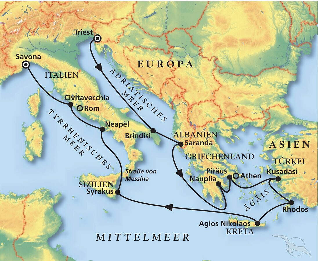 Erleben Sie 2 Wochen lang kulturelle und mediterrane Highlights auf dieser Kreuzfahrt entlang der zauberhaften Adria Küste und der Ägäis. Eine Traumkreuzfahrt im Mittelmeer erwartet Sie - und dies mit dem bekannten Service und Wohlfühlcharakter an Bord von MS Amera. Sie nehmen von Triest aus Kurs auf Apulien und Albanien und können in Athen die wunderbare Akropolis besuchen. Neben dem Kanal von Korinth stehen weitere eindrucksvolle Ziele in Griechenland auf Ihrem Programm. Freuen Sie sich auf die beiden Inseln Rhodos und Kreta, bevor Sie den antiken Spuren auf Sizilien folgen können. Natürlich darf bei dieser Kreuzfahrt auch die türkische Ägäis nicht fehlen. Von Kusadasi aus haben Sie die Möglichkeit das antike Ephesus zu besuchen. Im italienischen Neapel erwartet Sie nicht nur ein traumhafter Blick auf den Vesuv, sondern auch eine Ausflugsmöglichkeit ins antike Pompeji. Lust but not least können Sie von Civitaveccia aus Rom besuchen - wenn das kein krönender Abschluss dieser Kreuzfahrt ist. Willkommen an Bord von MS Amera!