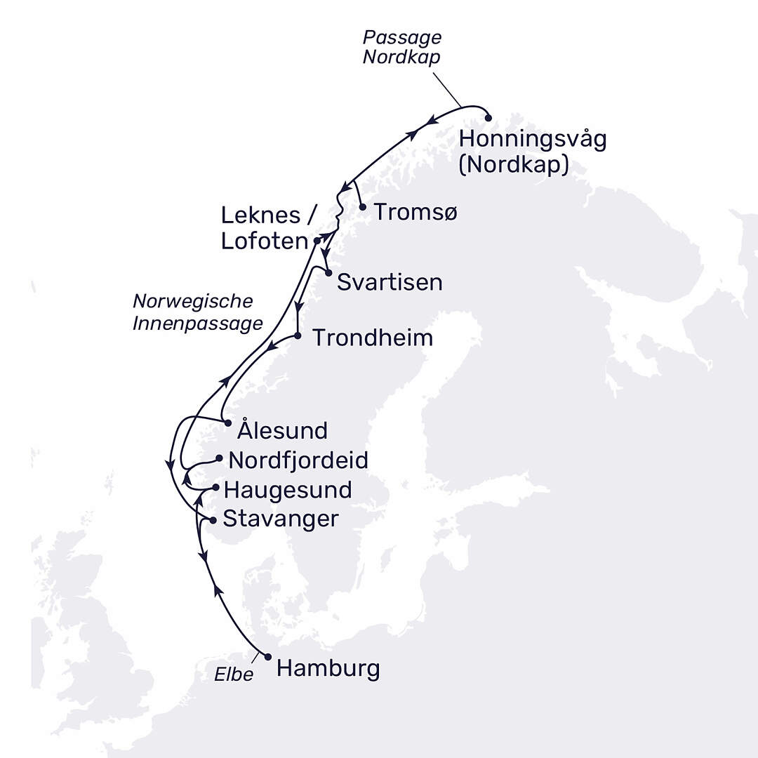 In der stillen Magie des nordischen Winters entfaltet Norwegen seinen ganz besonderen Zauber. Eingehüllt in warme Kleidung entdecken Sie während dieser Norwegenkreuzfahrt mit MS Hamburg tief verschneite Landschaften, gleiten mit der Seilbahn hinauf zum einsamen Berg Hoven oder folgen auf den Lofoten den Spuren der Wikinger, deren Geschichte hier inmitten der rauen Natur lebendig bleibt. Zwischen farbenfrohen Küstendörfern und schroffen Bergkulissen zeigt sich die nordische Wildnis von ihrer eindrucksvollsten Seite. Und dann - vielleicht ganz plötzlich - beginnt über Ihnen das geheimnisvolle Leuchten der Nordlichter. Wenn MS Hamburg in Honningsvåg anlegt, rückt ein lang gehegter Traum zum Greifen nah: einmal am Nordkap stehen und die unendliche Weite des Nordens spüren. Doch Ihre Winterreise hat noch mehr zu bieten: funkelnde Gletscher, eindrucksvolle Fjorde und unvergessliche Momente, die nur der arktische Winter schenken kann. Freuen Sie sich auf eine beeindruckende Kreuzfahrt nach Norwegen zu den spektakulären Nordlichtern!