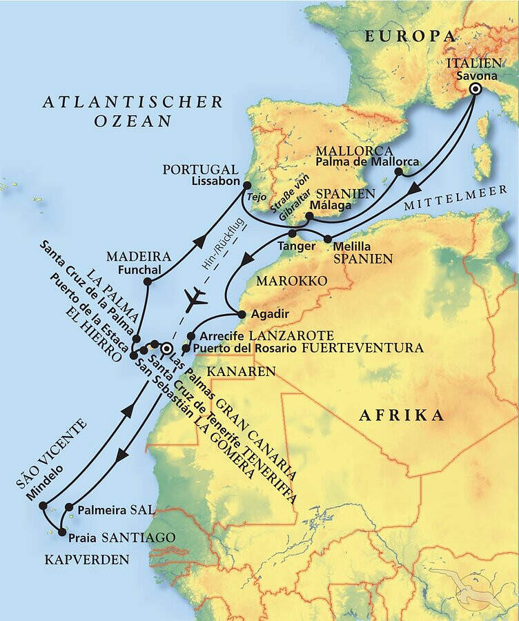Entfliehen Sie dem grauen Herbst und gönnen Sie sich eine erholsame Auszeit auf hoher See! Steigen Sie in Savona an Bord der eleganten MS Amera und erleben Sie eine 31-tägige Atlantikkreuzfahrt, die mediterranes Flair mit echter Seeluft verbindet. Während Sie den Hafen von Savona hinter sich lassen, eröffnet sich Ihnen eine unvergessliche Reise, die Sie vom Mittelmeer in den Artlantik und wieder zurück führen wird. Sie besuchen während dieser Kreuzfahrt 18 Häfen und 12 Inseln, lerbn gleich 7 Inseln der Kanaren kennen und tauchen in Marokko in das Flair aus 1001 Nacht. In Lissabon schnuppern Sie Seefahrerluft und Sie können die wunderbare Blumeninsel Madeira kennenlernen. Zum Abschluss dieser Atlantikkreuzfahrt entdecken Sie noch das wunderschöne Andalusien und besuchen die Baleareninsel Mallorca. Willkommen an Bord von MS Amera - Ihr stilvolles Zuhause auf den Weltmeeren.