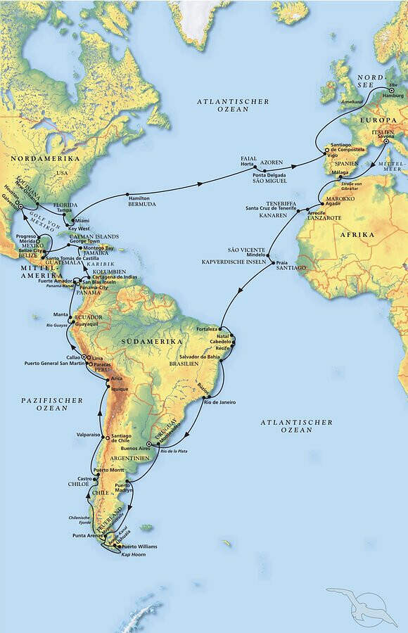 101 Tage - 53 Hafentage - 21 Länder - 14 Inseln. So knapp formuliert könnte man dieses Kreuzfahrterlebnis beschreiben. Es erwartet Sie im Dezember 2027 eine unbeschreibliche Kreuzfahrt mit MS Amera. Die "Große Amerika-Reise" startet im Hafen von Savona, führt Sie einmal quer über den Atlantik, durch die herrliche Inselwelt der sonnenverwöhnten Karibik und einmal rund um Südamerika, bevor es wieder durch den Atlantik und durch die Nordsee zurück nach Hamburg geht. Besuchen Sie die schönsten Ziele Südamerikas wie Brasilien, Argentinien und Chile, entdecken Sie die Maya Kultur in Mittelamerika, oder freuen Sie sich auf die sonnenverwöhnten Cayman Islands. Weitere Highlights dieser Kreuzfahrt sind sicherlich die Umrundung des legendären Kap Horns, oder die Fahrt durch den berühmten Panama Kanal, der den Pazifik mit dem Atlantik verbindet. Willkommen an Bord von MS Amera.