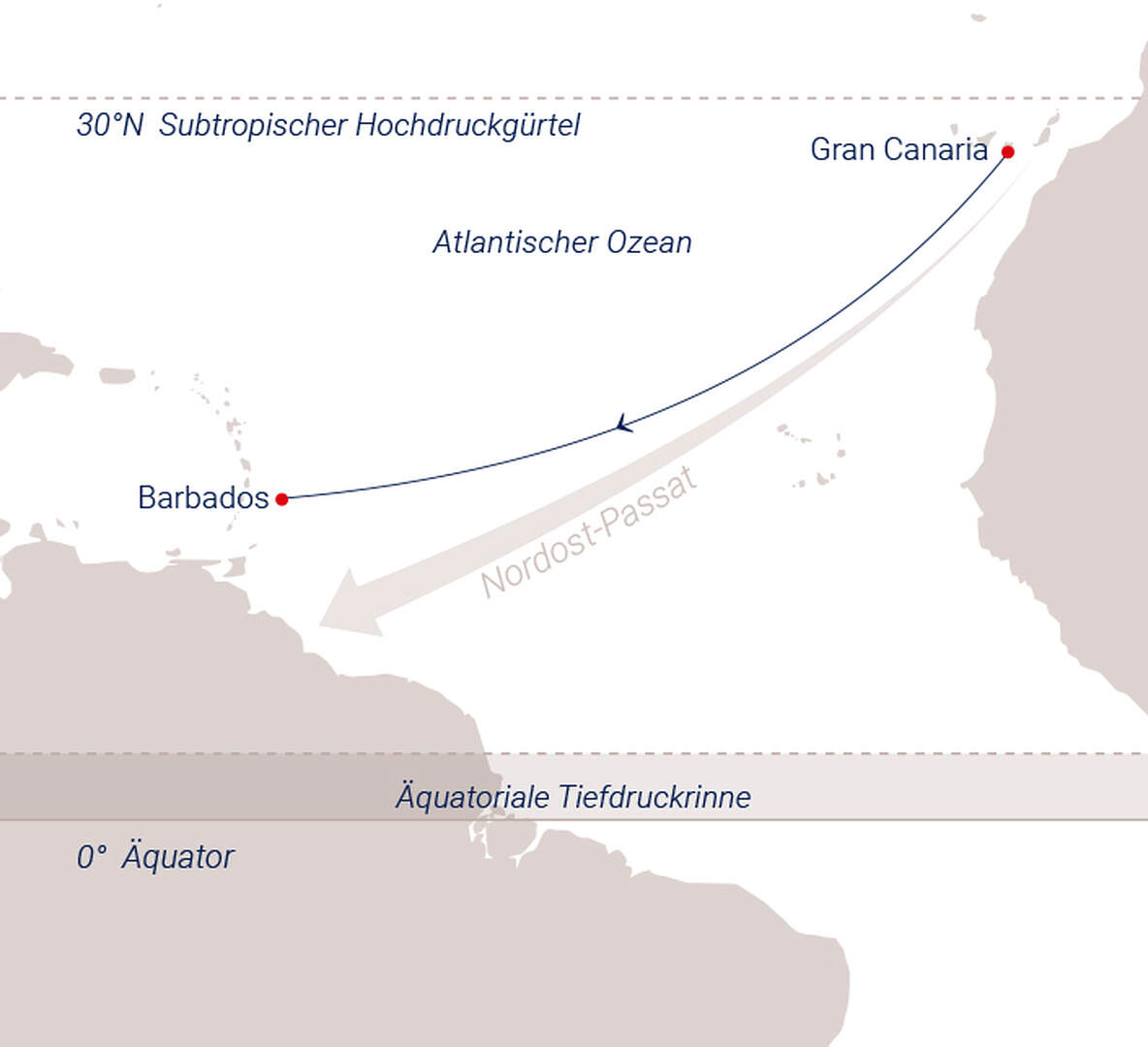 Die Atlantiküberquerung ist die Königsdisziplin - und ein großartiges Abenteuer für echte Segelfans. Fast zwei Wochen lang ist kein Land zu sehen, fast zwei Wochen lang geht es ausschließlich ums Segeln. Wenn auf der berühmten Kolumbus-Route zwischen der der Kanareninsel Gran Canaria und der Karibik nur das Schiff und die Elemente den Tagesrhythmus bestimmen, kann man sich gründlich den Alltag aus der Seele wehen lassen. Diese Transatlantik Segelkreuzfahrt mit Sea Cloud II nimmt Sie mit auf eine unvergessliche Segelkreuzfahrt einmal quer über den Atlantik - von Gran Canaria bis Barbados.
