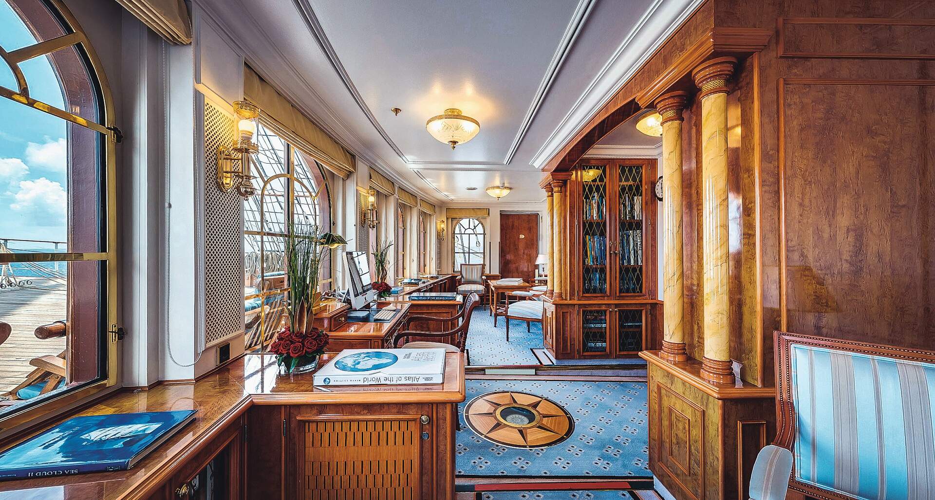 Auch die Bibliothek der SEA CLOUD II bietet verschiedenste Möglichkeiten, die Zeit an Bord so abwechslungsreich wie nur möglich zu gestalten. Hier können Sie lesen, Postkarten oder Briefe schreiben, sich mit Gleichgesinnten zum Spielen treffen, in der Videothek nach einem Film fürs Kabinenkino stöbern, vom Laptop aus E-Mails versenden - oder einfach entspannen und die ruhige Atmosphäre genießen.