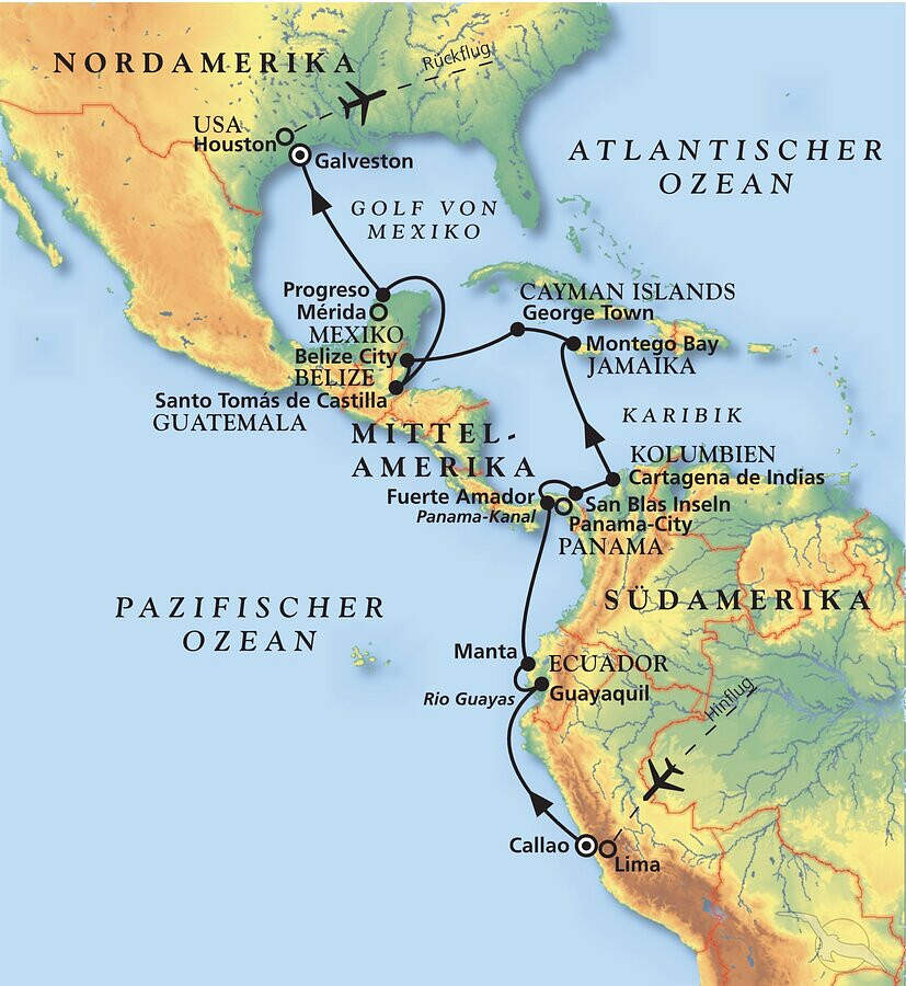 Diese Kreuzfahrt mit unserer beliebten MS Amera vereint gleich mehrere Facetten. Von den Inkas geht es zu den Kuna-Indianern und zu den Mayas, Sie erleben karibische Schönheiten zwischen Cartagena de Indias und Chichén Itzá und Sie erleben ein Meisterwerk der Technik: den berühmten Panama Kanal, der den Pazifik mit dem Atlantik verbindet. Vielfältiger kann eine Karibikkreuzfahrt, die in Peru beginnt und in Houson / USA endet, fast schon nicht sein. Spannende mögliche Landausflüge vervollständigen dieses Reiseerlebnis. Wie wäre es mit einem 3-tägigen Ausflug nach Macchu Picchu? Oder wollen Sie sehen, wo die berühmten Panama Hüte in Ecuador hergestellt werden? Ihnen ist eine Floßfahrt auf dem Martha-Brae-Fluss lieber? All das und noch viel ist möglich. Seien Sie gespannt und freuen sich auf eine wunderbare 22-tägige Karibikkreuzfahrt, bei der die Flüge ab/an Frankfurt für Sie bereits eingeschlossen sind.