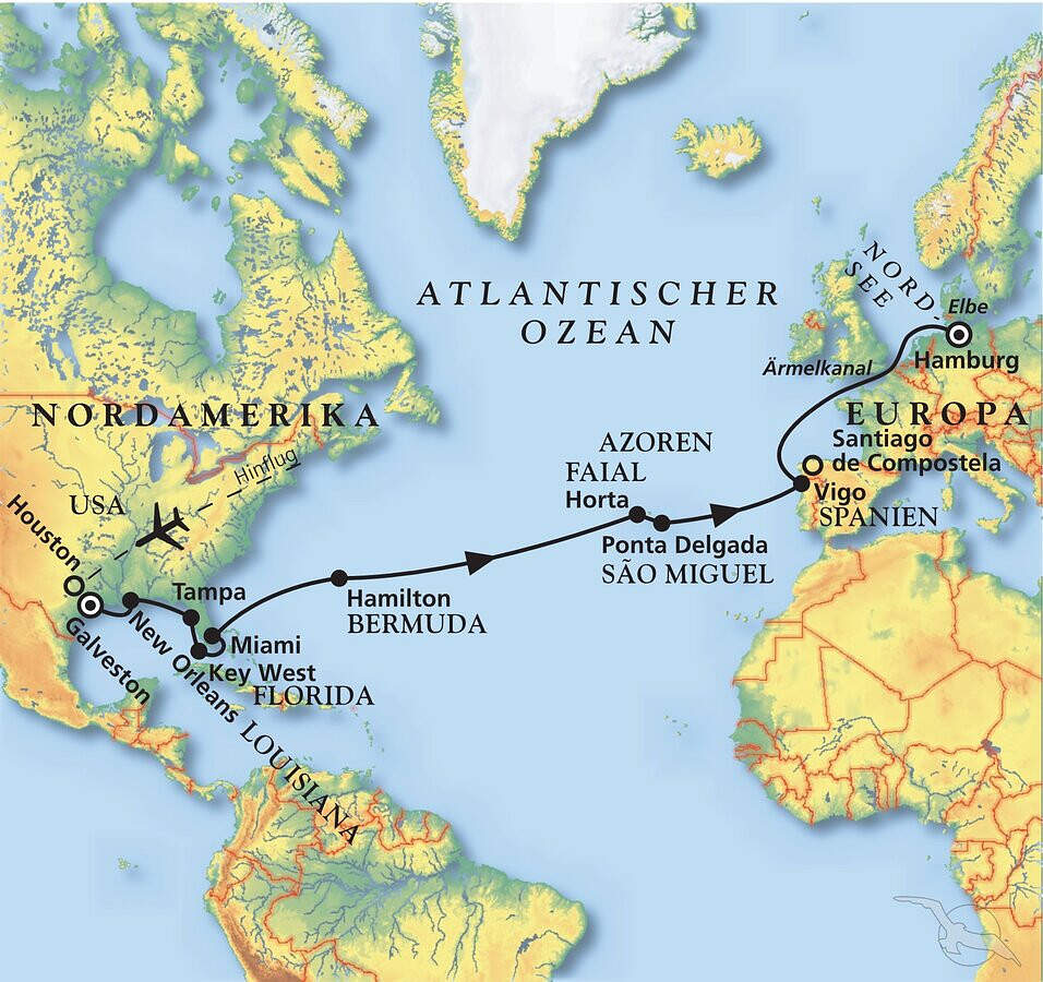 Per Flug geht es von Frankfurt nach Houston / Texas. Transfer zum Hafen in Galveston und Einschiffung an Bord von MS Amera.