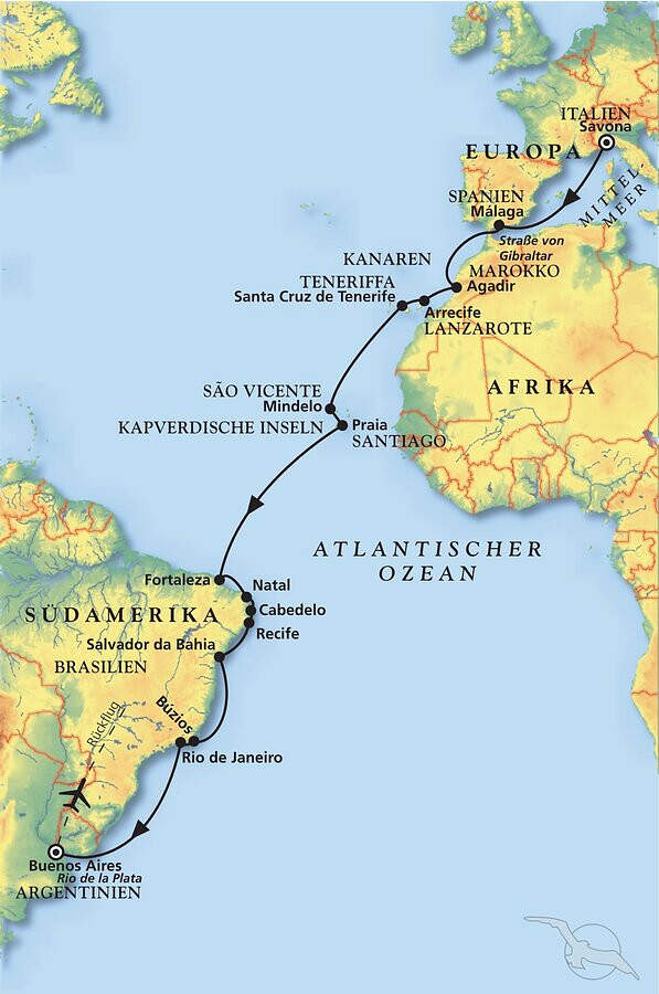 Einmal quer über den Atlantik - von der alten in die neue Welt - führt Sie diese wunderbare Kreuzfahrt mit MS Amera. Entdecken Sie an Bord dieses beliebten Kreuzfahrtschiffes die bunte Welt Südamerikas, nachdem Sie Europa hinter sich gelassen haben. Bevor Sie jedoch Ihre Fahrt über den Atlantik antreten, wartet noch das spanische Andalusien, Marokko, die Kanarischen Inseln, als auch die Kapverden auf Sie. Weihnachten verbringen Sie ganz entspannt an Bord in festliche Atmosphäre, bevor Sie das neue Jahr ebenso festlich vor Cabedelo in Brasilien Willkommen heißen. In gleich sieben brasilianischen Häfen haben Sie Gelegenheit, die Lebensfreude der Südamerikaner kennen und lieben zu lernen. Weiter geht es von Rios Copacabana zum "Paris Amerikas" - nach Buenos Aires, der Hauptstadt Argentiniens. Per Flug geht es von Buenos Aires aus dann schließlich wieder zurück in die Heimat. Eine Transatlantikkreuzfahrt mit vielen Facetten erwartet Sie.