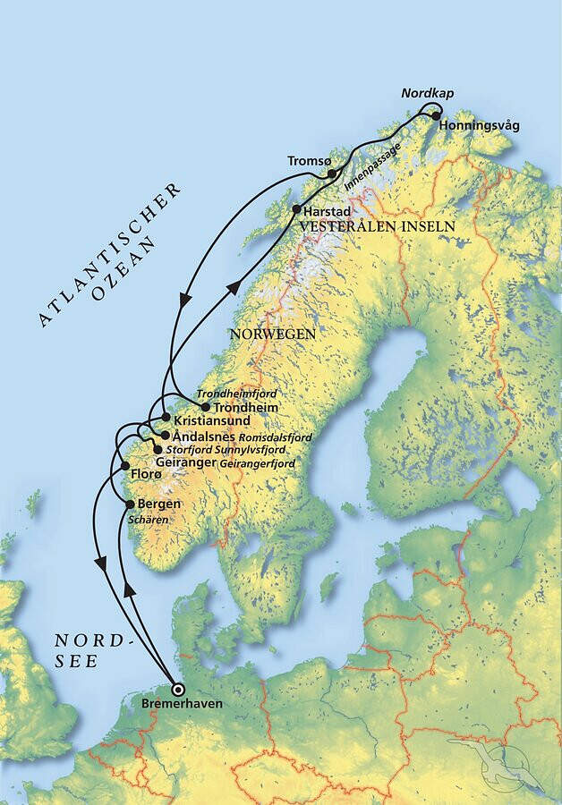Lernen Sie die herrlichen Naturwunder Norwegens auf dieser Kreuzfahrt mit MS Amadea kennen - unser "Traumschiff" zeigt Ihnen die Schönheiten Norwegens. Sie fahren durch die Nordsee gen Norden und überqueren den Polarkreis, um tags darauf die herrliche Fjordwelt Norwegens zu erleben. Wenn Sie in Honningsvåg sind, darf natürlich ein Ausflug zum Nordkap nicht fehlen. Entlang der norwegischen Festlandküste geht es wieder in Richtung Süden. Eine Fahrt durch den Geirangerfjord ist bei einer jeden Norwegenkreuzfahrt sicherlich ein Muss, und natürlich unternehmen Sie auch eine norwegische Innenpassage. Herrlich! Wandeln Sie mit MS Amadea auf den Spuren der Postschiffe entlang der Fjordküste Norwegen bis zum Nordkap und zurück.