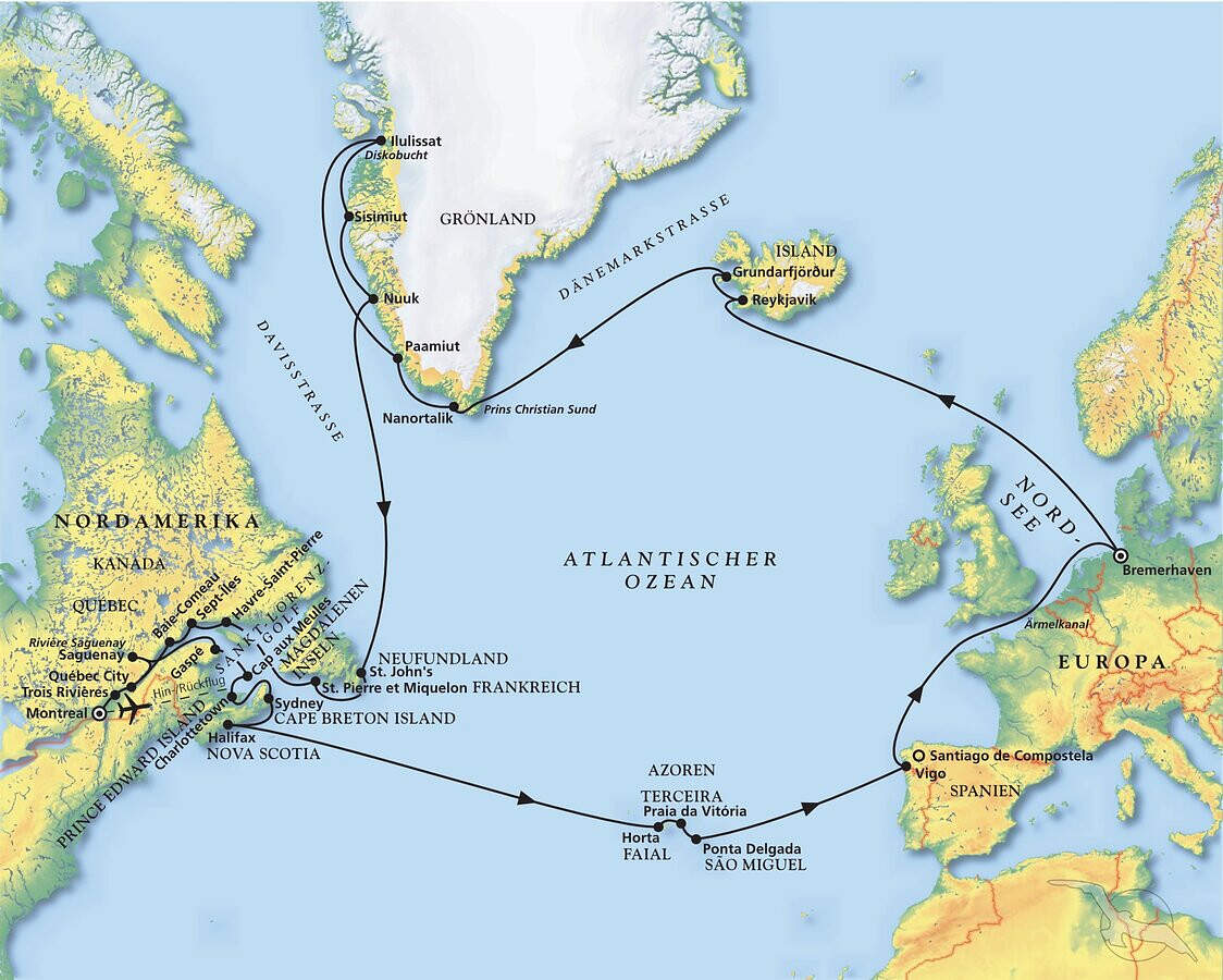 Ihre große Grönland und Kanada Kreuzfahrt beginnt in Bremerhaven. Einschiffung an Bord von MS Amadea zwischen ca. 15-17 Uhr.