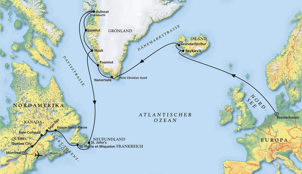 Ihre große Grönland und Kanada Kreuzfahrt beginnt in Bremerhaven. Einschiffung an Bord von MS Amadea zwischen ca. 15-17 Uhr.