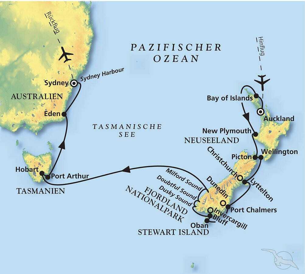 Erleben Sie Neuseeland in seiner ganzen Vielfalt auf einer exklusiven Kreuzfahrt mit MS Amadea - inklusive Flügen ab/an Frankfurt. Diese außergewöhnliche Traumreise führt Sie zu den schönsten Orten der Nord- und Südinsel Neuseelands: von der pulsierenden Metropole Auckland über die charmante Hauptstadt Wellington bis in das spektakuläre Fjordland der Südinsel, wo steile Felswände, Wasserfälle und unberührte Natur das Bild prägen. Unter dem Namen „Aotearoa“ - das Land der langen weißen Wolke entdecken Sie während dieser Kreuzfahrt gleich neun faszinierende Reiseziele und erleben Neuseeland intensiv. Genießen Sie entspanntes Reisen an Bord der eleganten MS Amadea, während draußen pittoreske Küsten, abgelegene Inseln und majestätische Fjorde an Ihnen vorbeiziehen. Nach unvergesslichen Tagen in Neuseeland erwartet Sie ein eindrucksvolles Finale: Tasmanien mit seiner wilden Natur und die weltberühmte Metropole Sydney, wo Ihre Kreuzfahrt stilvoll endet. Diese Neuseeland Kreuzfahrt mit Flug ab Frankfurt vereint Naturwunder, Städteerlebnisse und höchsten Komfort - eine Reise, die Fernweh weckt und Erinnerungen fürs Leben schafft.