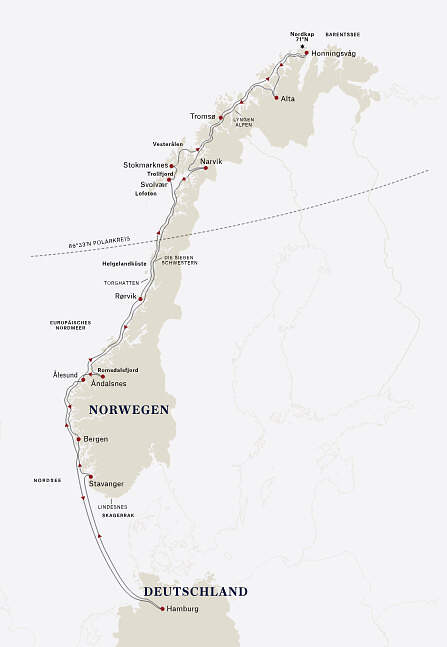 In Hamburg erwartet Sie MS Finnmarken von der Hurtigruten Flotte zur Einschiffung. Sie fahren gen Norden in Richtung norwegische Küste. Erleben Sie 2 Wochen lang unzählige Seemeilen lang ein unverkennbar norwegisches Abenteuer entlang spektakulärer Küstenlandschaften.