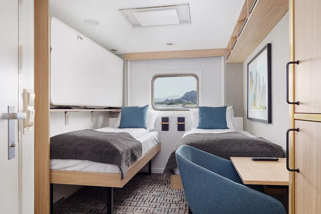Die Standardkabinen (Kategorie U, P, N, J, L, I, A und D) unterscheiden sich im Wesentlichen durch Lage und Größe, die auch innerhalb einer Kategorie variieren können. Alle Standardkabinen sind modern und komfortabel mit Dusche, WC Bettwäsche, Handtüchern und Föhn ausgestattet. Die 3- und 4-Bett-Kabinen haben zusätzliche Oberbetten. In den Außenkabinen gibt es größtenteils ein großes rechteckiges Fenster, zum Teil mit Bullauge auf den Decks 2 und 3 bzw. Decks A – C. Bei einigen Kabinen können Rettungsboote und/ oder deren Aufhängung die Sicht einschränken. Die Kategorie D hat ein Waschbecken in der Kabine und Dusche/ WC auf dem Gang. Nur einige Kabinen verfügen über einen Föhn, dafür sind in allen Kabinen Bettwäsche, Handtücher und der entsprechende Wechselservice vorhanden. Gemäß der Anordnung des Kapitäns können bei Schlechtwetterlage die Bullaugen der Kabinen auf den unteren Decks verschlossen werden. Einige Bullaugen bleiben von Oktober bis April meist geschlossen. Auf allen Hurtigruten Schiffen, außer auf der Lofoten und Nordstjernen, befinden sich große, rollstuhlgerechte Kabinen (ca. 16 – 20m2).