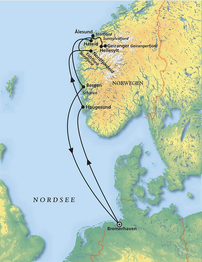 Erleben Sie auf dieser Norwegenkreuzfahrt mit MS Artania die ganze Magie der südnorwegischen Fjordwelt. Majestätische, steil aufragende Fjordwände, smaragdgrüne Buchten und tosende Wasserfälle begleiten Sie auf einer der schönsten Routen entlang der norwegischen Küste. Von Ihrem komfortablen Schiff aus genießen Sie spektakuläre Panoramen, während abwechslungsreiche Landgänge faszinierende Einblicke in Natur, Kultur und Geschichte bieten. Diese Fjordkreuzfahrt ab Bremerhaven verbindet Entspannung an Bord mit unvergesslichen Naturerlebnissen - ideal für alle, die Norwegen intensiv und genussvoll entdecken möchten. Auf Ihrer Kreuzfahrt besuchen Sie charmante Küstenorte und beeindruckende Naturhäfen: In Haugesund wandeln Sie auf den Spuren der Wikinger, während Nordfjordeid mit ursprünglicher Landschaft und ruhigem Fjordflair begeistert. Die weltberühmten Fjorde von Geiranger und Hellesylt zählen zu den absoluten Höhepunkten Norwegens und bieten Postkartenmotive pur. Jugendstil-Charme erwartet Sie in Ålesund, bevor die traditionsreiche Hansestadt Bergen mit ihrem bunten Hafenviertel Bryggen und dem reizvollen Hinterland den krönenden Abschluss bildet.