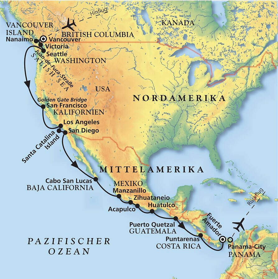 Freuen Sie sich auf eine unvergessliche Nordamerika-Kreuzfahrt mit MS Artania und entdecken Sie die faszinierende Vielfalt zwischen Kanada, den USA und Mittelamerika. Ihre Traumreise beginnt im weltoffenen Vancouver und führt entlang der spektakulären westkanadischen und amerikanischen Pazifikküste. Freuen Sie sich auf legendäre Metropolen, sonnenverwöhnte Küsten und exotische Hafenstädte. Diese Kreuzfahrt entlang der US-Westküste und Mittelamerikas verbindet Natur, Kultur und Großstadtflair zu einem außergewöhnlichen Reiseerlebnis. Ideal für Genießer, Entdecker und alle, die Nordamerika vom Meer aus erleben möchten. Zu den absoluten Höhepunkten zählen das kreative San Francisco mit der berühmten Golden Gate Bridge und das glamouröse Los Angeles, Heimat von Hollywood und endlosen Stränden. Seattle begeistert mit maritimem Charme und moderner Kultur, während San Diego mit entspanntem Lebensgefühl und mildem Klima punktet. In Acapulco erleben Sie mexikanisches Temperament und beeindruckende Küstenlandschaften. Exotische Natur und kulturelle Vielfalt erwarten Sie in Costa Rica und Guatemala, bevor Ihre Reise im panamaischen Fuerte Amador einen krönenden Abschluss findet. Bei dieser Nordamerikakreuzfahrt sind übrigens die Flüge ab und an Frankfurt bereits inklusive.