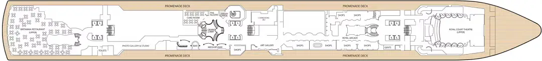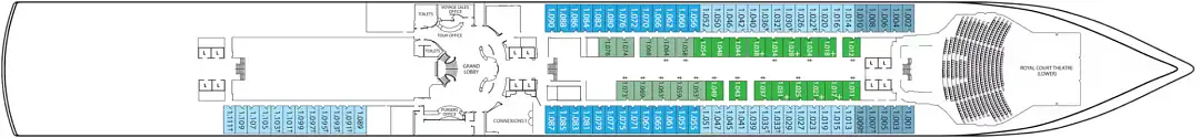 Bibliothek & Buchhandlung, ConneXions™, "Country House" Soirées, Cunard Classic Film Club, Cunard Galerie, Cunard Insights™ - Bildungsprogramm, Cunard Royal Spa & Fitness-Center, Empire Casino, Garten-Partys, Museumspfad, Pools, Promenadendeck, Royal Arcade - Shops, Royal Astronomical Society, Royal Court Theater, Sport an Deck wie Boule, Paddle-Tennis oder Krocket, Tanzunterricht, Terrasse, "The Zone" Kinder-Club & "The Play Zone" Kleinkinder-Spielzone