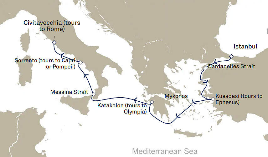 Erleben Sie eine wunderbare Mittelmeerkreuzfahrt an Bord unserer eleganten Queen Elizabeth von Cunard - eine Reise voller Geschichte, Kultur und mediterraner Lebensfreude. Auf dieser stilvollen Kreuzfahrt folgen Sie legendären Seewegen zwischen Orient und Okzident und genießen dabei erstklassigen Service, britische Eleganz und unvergessliche Ausblicke. Ein besonderes Highlight ist die eindrucksvolle Durchfahrt durch die Straße von Messina, bevor Ihre Reise im Hafen von Civitavecchia, dem Tor zur Ewigen Stadt Rom, ihren krönenden Abschluss findet. Ihre Route führt Sie zunächst von der faszinierenden Metropole Istanbul, wo Europa und Asien aufeinandertreffen, nach Kusadasi, dem idealen Ausgangspunkt für das antike Ephesos. Auf der griechischen Insel Mykonos erwarten Sie weiß getünchte Häuser, lebendige Gassen und traumhafte Strände. Katakolon öffnet Ihnen das Tor zu Olympia, der Wiege der Olympischen Spiele, während Sorrent mit spektakulären Küsten, Zitronenhainen und dem Blick auf den Vesuv verzaubert. Den Abschluss bildet Civitavecchia, von wo aus Sie die kulturellen Schätze Roms entdecken können - ein perfektes Finale dieser außergewöhnlichen Mittelmeerkreuzfahrt.
