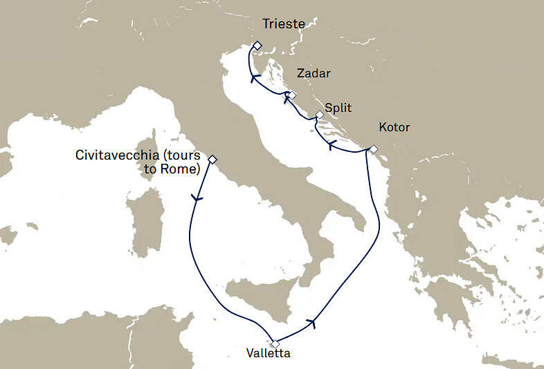 Erleben Sie eine 8-tägige Adria- und Mittelmeerkreuzfahrt von Rom nach Triest an Bord unserer eleganten Queen Elizabeth von Cunard. Starten Sie Ihre Reise im Hafen von Civitavecchia, dem idealen Ausgangspunkt nach einem Besuch der Ewigen Stadt Rom, und genießen Sie britische Eleganz, exzellenten Service und entspannte Seetage. Diese stilvolle Kreuzfahrt verbindet mediterrane Kultur, beeindruckende Küstenlandschaften und historische Hafenstädte entlang der Adria - perfekt für Genießer und Entdecker. Ihre Route führt Sie zunächst nach Malta, wo jahrtausendealte Geschichte, barocke Architektur und das tiefblaue Mittelmeer begeistern. In Kotor erwartet Sie eine der schönsten Fjordlandschaften Europas, umgeben von mittelalterlichen Mauern und dramatischen Bergen. Split fasziniert mit dem monumentalen Diokletianpalast, einem UNESCO-Weltkulturerbe direkt an der Uferpromenade. In Zadar treffen römische Vergangenheit und moderne Kunstinstallationen aufeinander, bevor Ihre Reise im eleganten Triest endet - einer Stadt, die italienische, österreichische und slawische Einflüsse auf einzigartige Weise vereint.