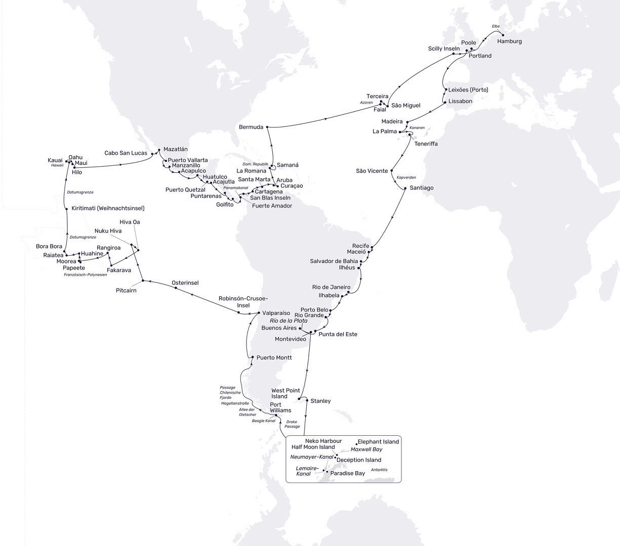 Starten Sie Ihre große Weltreise ab Hamburg und entdecken Sie an Bord unserer deutschsprachigen MS Hamburg die faszinierendsten Orte unseres Planeten. Von der schillernden Copacabana in Rio de Janeiro führt diese außergewöhnliche Kreuzfahrt über die wilden Falklandinseln und die majestätische Antarktis durch die spektakulären chilenischen Fjorde bis in die Traumwelten der Südsee. Erleben Sie unvergessliche Tage auf Hawaii, besuchen Sie legendäre Städte wie Buenos Aires, Valparaíso, Papeete und Acapulco und passieren Sie den weltberühmten Panamakanal. Zwölf paradiesische Südseeinseln - darunter das wunderschöne Bora Bora - lassen Sehnsüchte wahr werden, während die Überquerung der internationalen Datumsgrenze diese Reise zu einer echten Zeitreise macht. Diese Weltreise - eine Reise um die halbe Welt - ist mehr als eine Kreuzfahrt: Sie ist ein einmaliges Abenteuer voller Emotionen, Naturwunder und globaler Vielfalt - komfortabel, intensiv und einzigartig ab Hamburg. Seien Sie dabei und entdecken Sie Südamerika, die Antarktis, die Südsee und Mittelamerika.