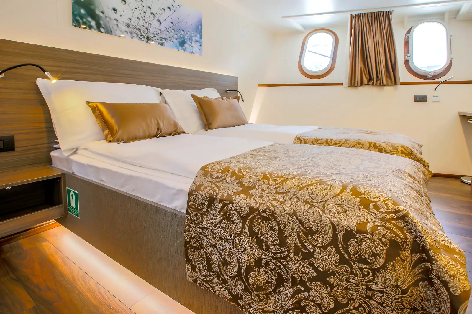 Ihre Kabinennummer erhalten Sie in der Regel mit der Buchungsbestätigung. Gerne nehmen wir bei Buchung Ihren unverbindlichen Kabinenwunsch entgegen, Angaben über Kabinennummern sind jedoch ausdrücklich kein Vertragsbestandteil. Schiffstypische Geräusche und Gerüche, wie zum Beispiel vom Schiffsmotor, der Klimaanlage beziehungsweise Lüftung usw. sind in fast allen Räumlichkeiten zu vernehmen. Die Kabinen mit dem Vermerk „achtern“ liegen im hinteren Teil des Schiffes. In diesen Kabinen sind bei fahrendem Schiff verstärkt Maschinengeräusche wahrzunehmen. In den Kabinen, die im vorderen Schiffsteil liegen, sind bei Anlegemanövern und Schleusendurchfahrten verstärkte Geräusche des Bugstrahlruders zu hören. Alle Kabinen sind Außenkabinen mit Fenster oder Bullauge. Bitte beachten Sie, dass kleine Sichteinschränkungen durch Treppen / Verstrebungen möglich sind.